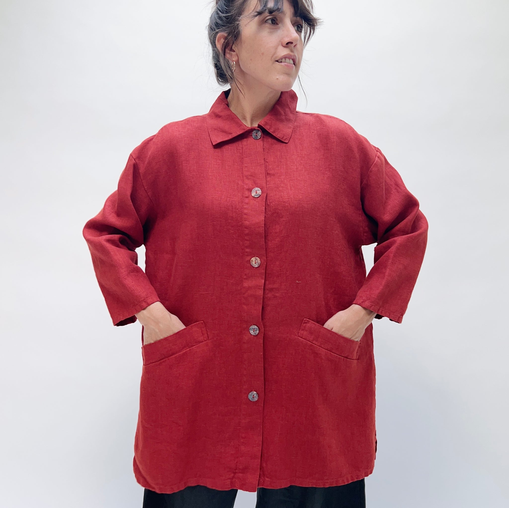 100% linen, mother of pearl buttons.