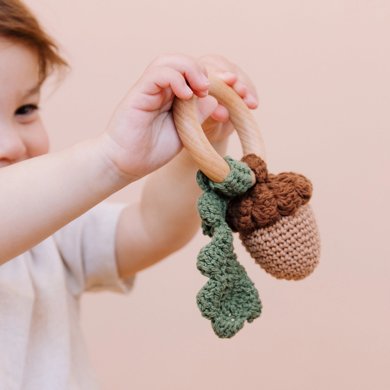 Crafted for tiny hands, this adorable acorn teether doubles as a playful rattle, creating a delightful sensory experience. Made from soft cotton and beech wood for safe chewing.