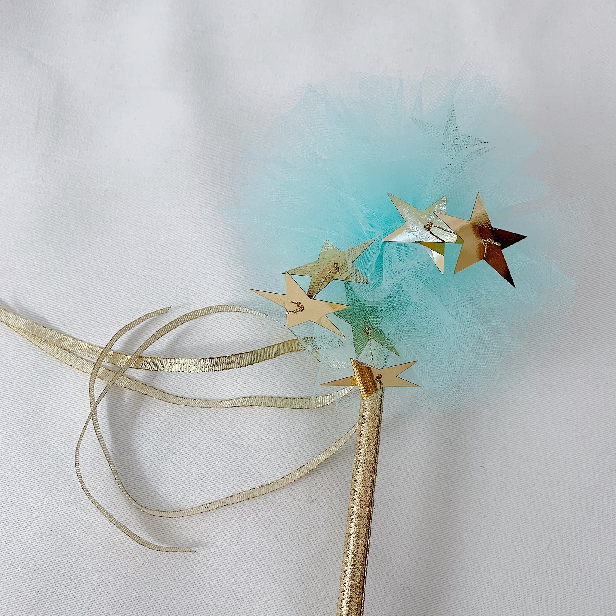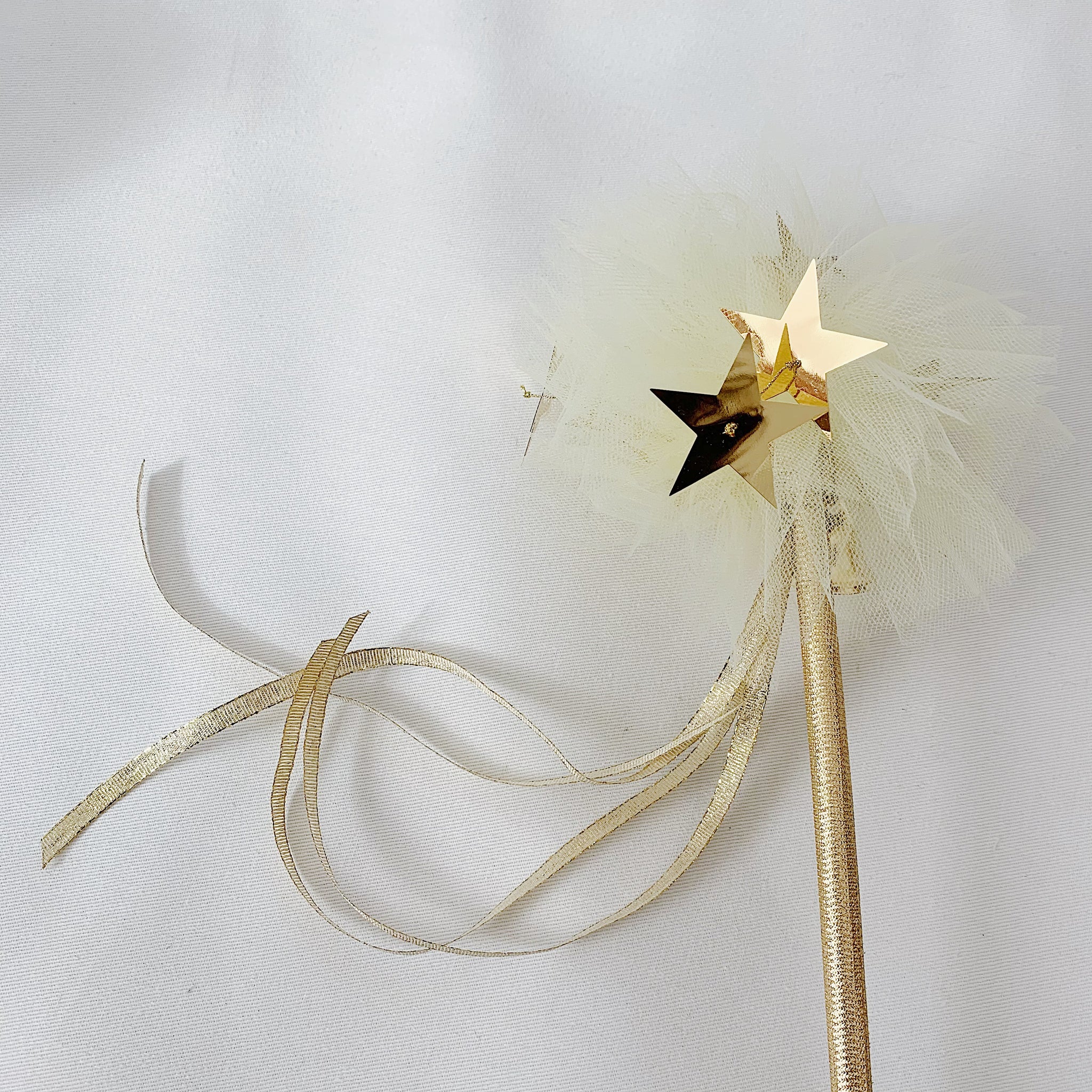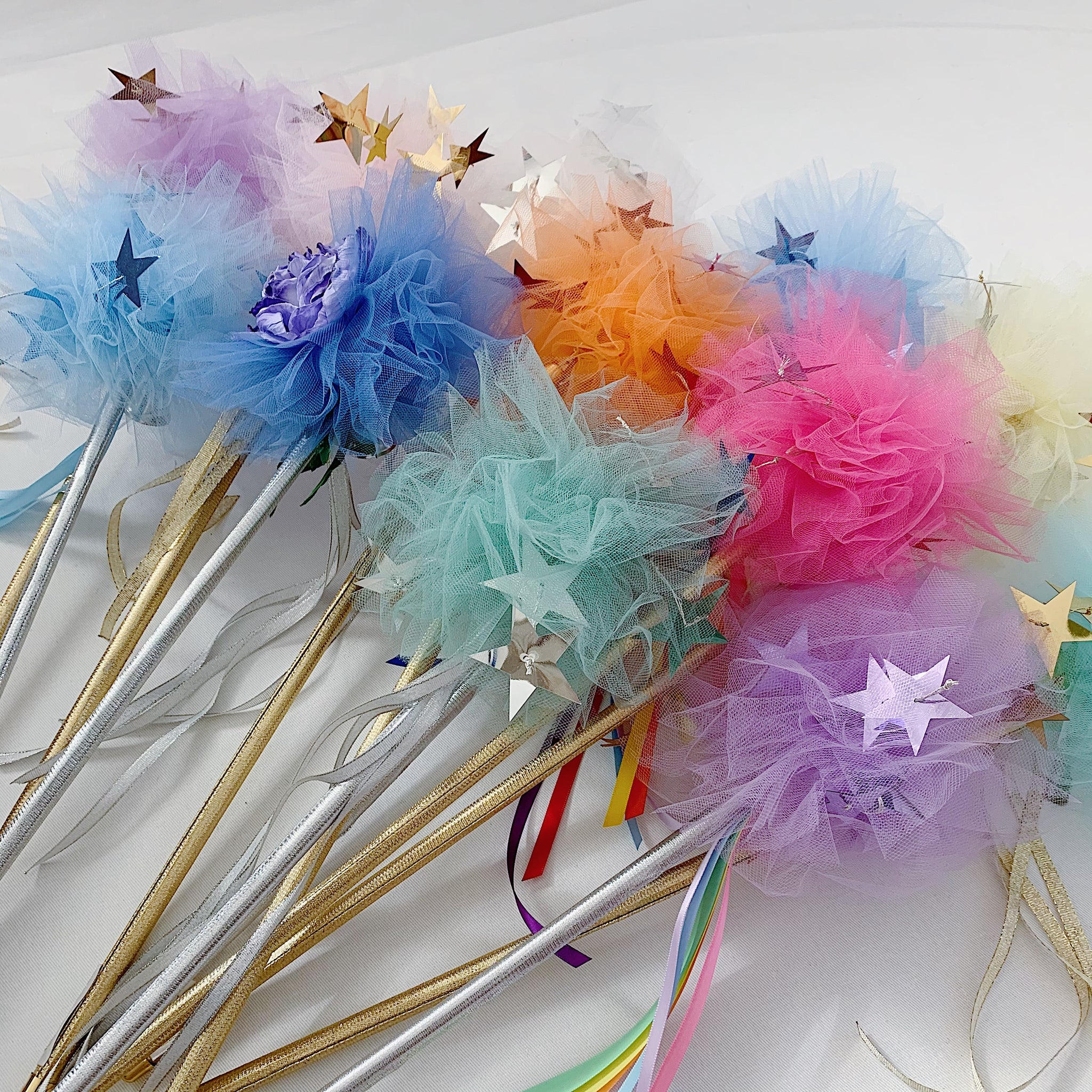 Beautiful ribbon wrapped fairy wands with shiny stars or flowers, and always a bell to tinkle!