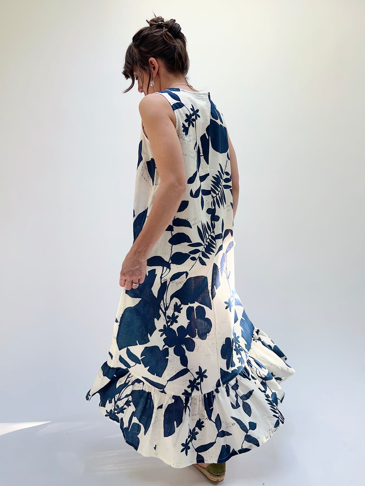 A chic A-frame dress featuring a ruffled hi-low hem in a wonderful foliage inspired print.