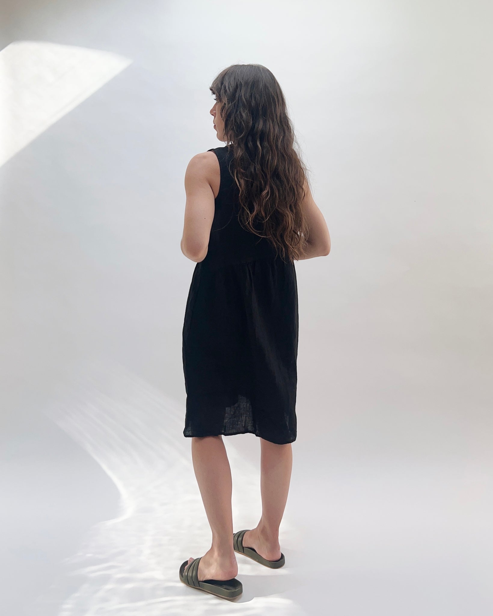 This sleeveless linen babydoll dress features a pleated waist and a flattering v-neck. It's an effortless and timeless style that you can style endlessly.