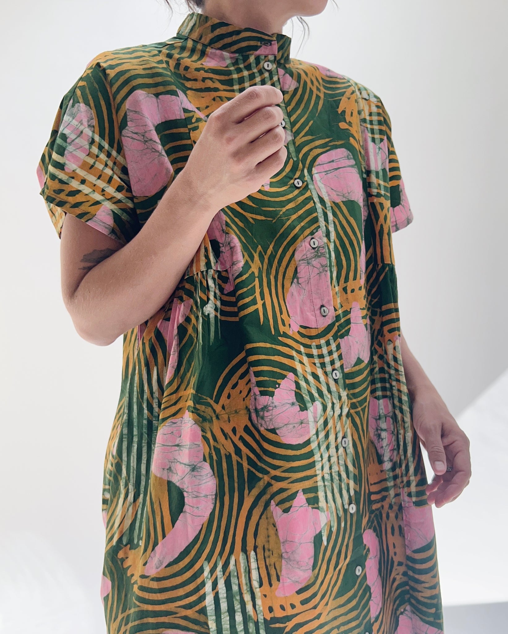 A very popular loose fitting cotton dress that has a mandarin collar and a button front. Back cinch tie and gather details at the sides give shape to this sculptural silhouette. Inseam pockets. Fit is oversized.