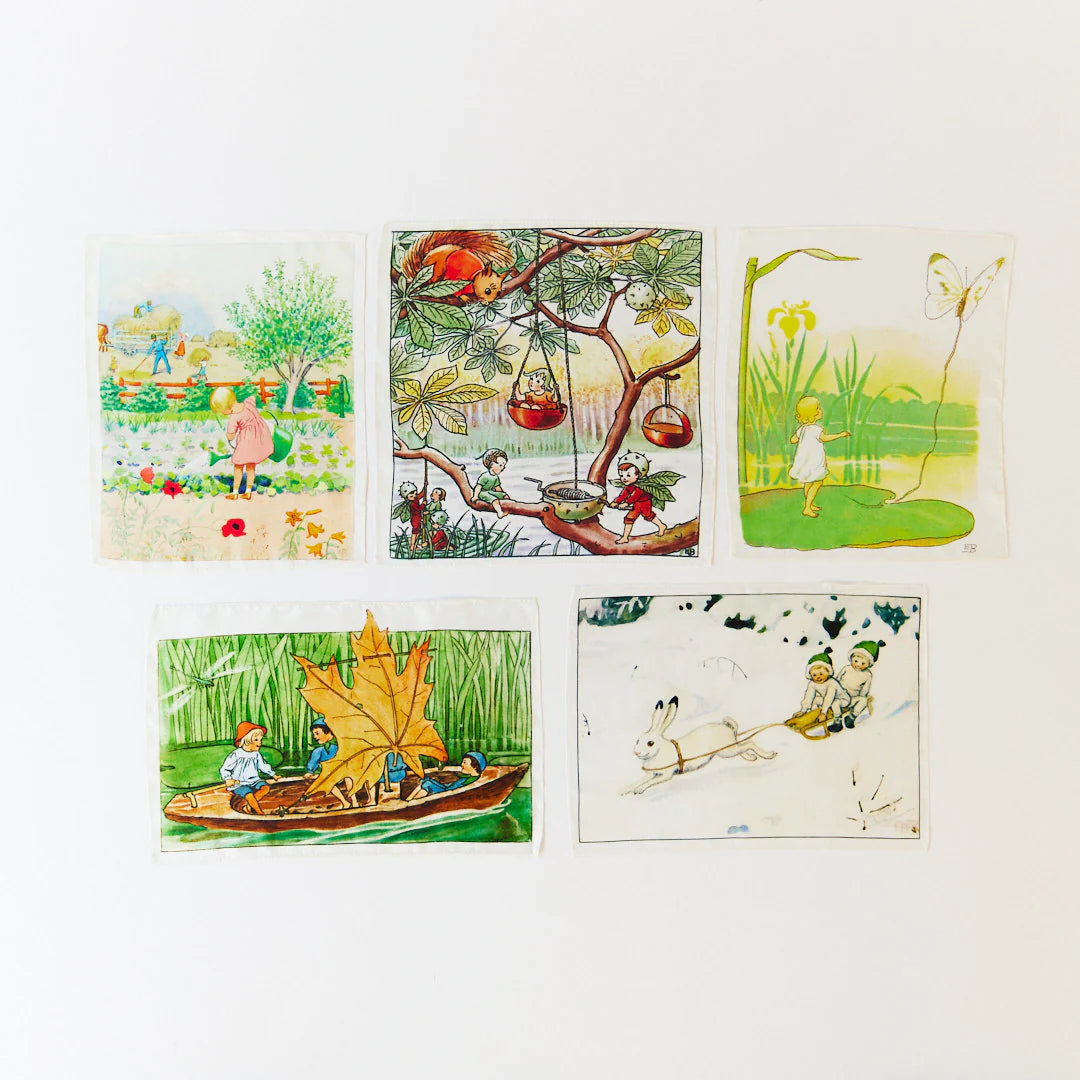 Mini Mystery Boxes are a delight to open, each box contains one Mini-Mini Playsilk featuring charming illustrations inspired by Elsa Beskow's timeless stories. You will receive one Playsilk in a special Mystery Box, collect all 5! The scenes you may receive include Thumbelina, Acorn Children, Gardening, Sailing and Sledding.