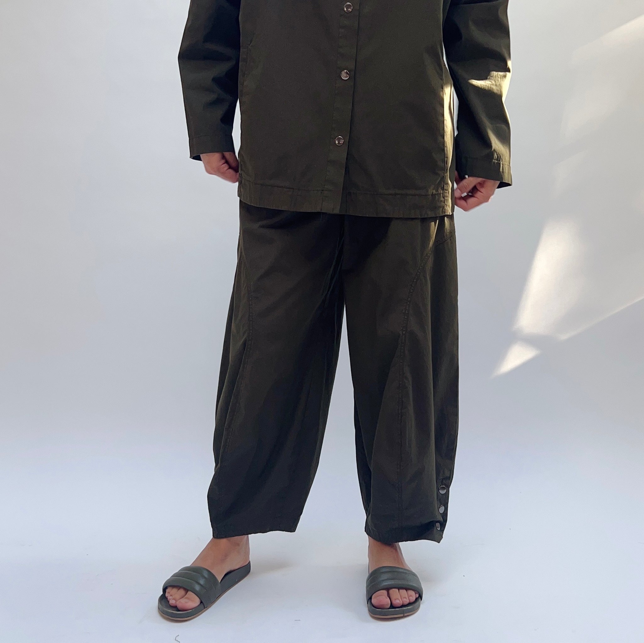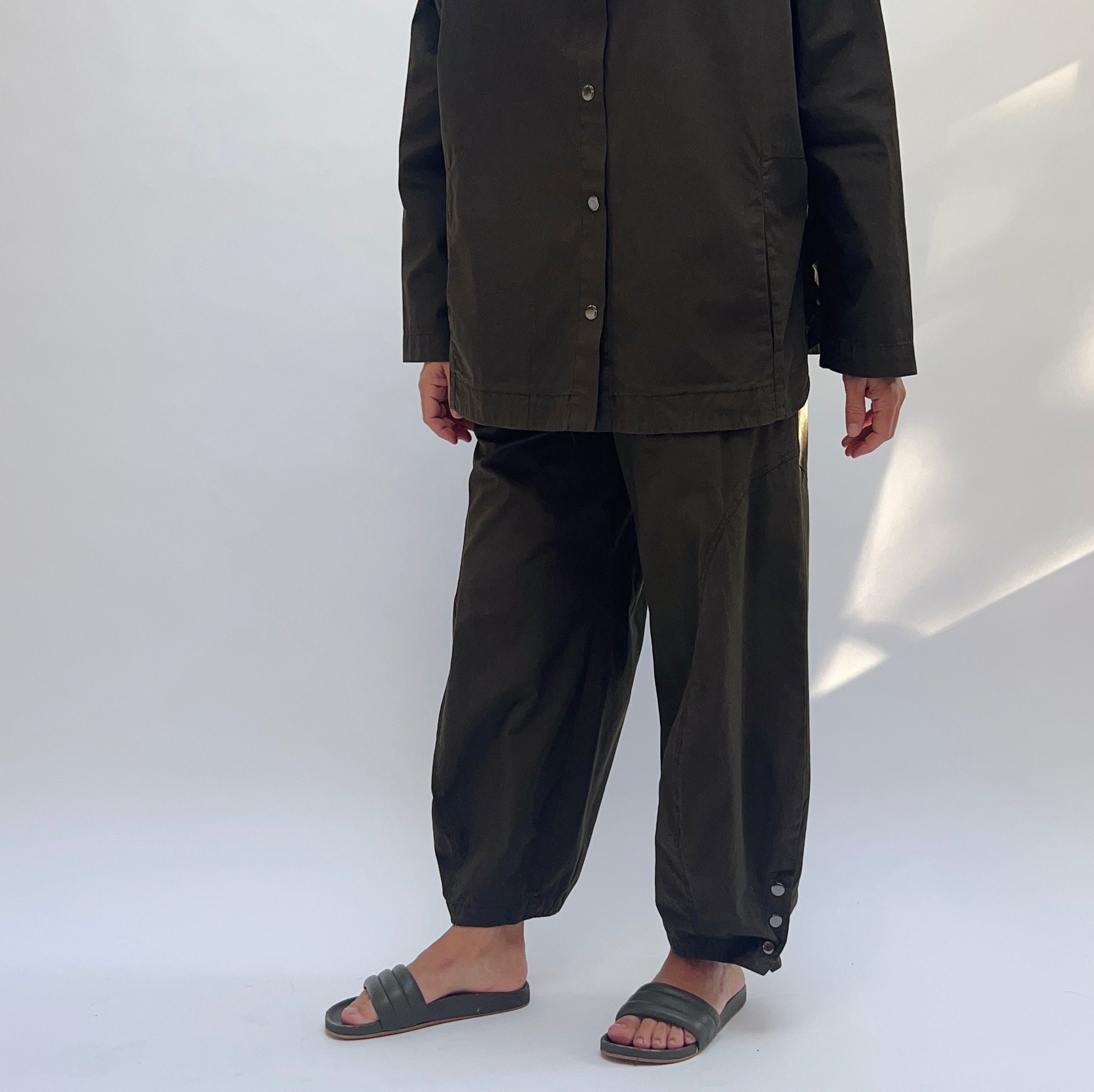 Perfectly cotton/lyocell pants featuring roomy pockets, an elastic waistband, side-seam detailing, and snap buttons at each ankle. These pants are comfortable while looking polished and cool - a pair you'll want to throw on again and again!