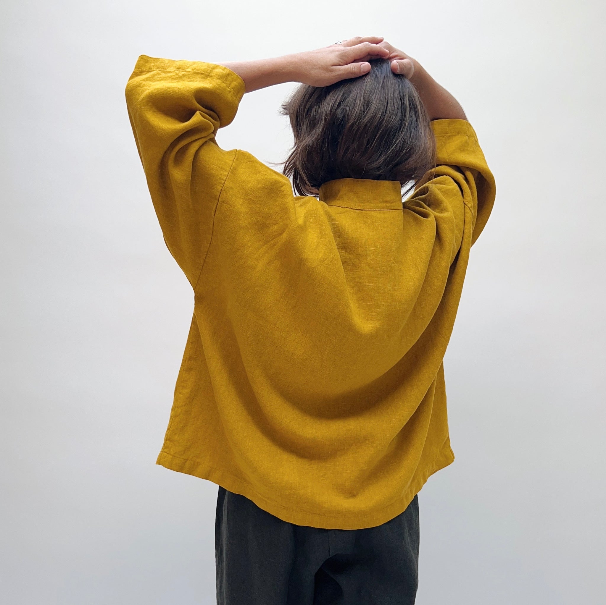 A lovely linen jacket with shell buttons down the front and a standing collar.
