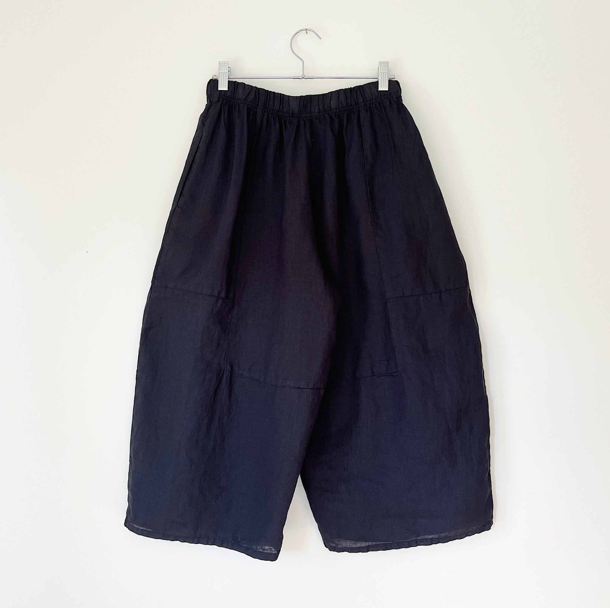 Sculptural cropped wide legged linen pant with a curved seam, an elastic waistband, and pockets.