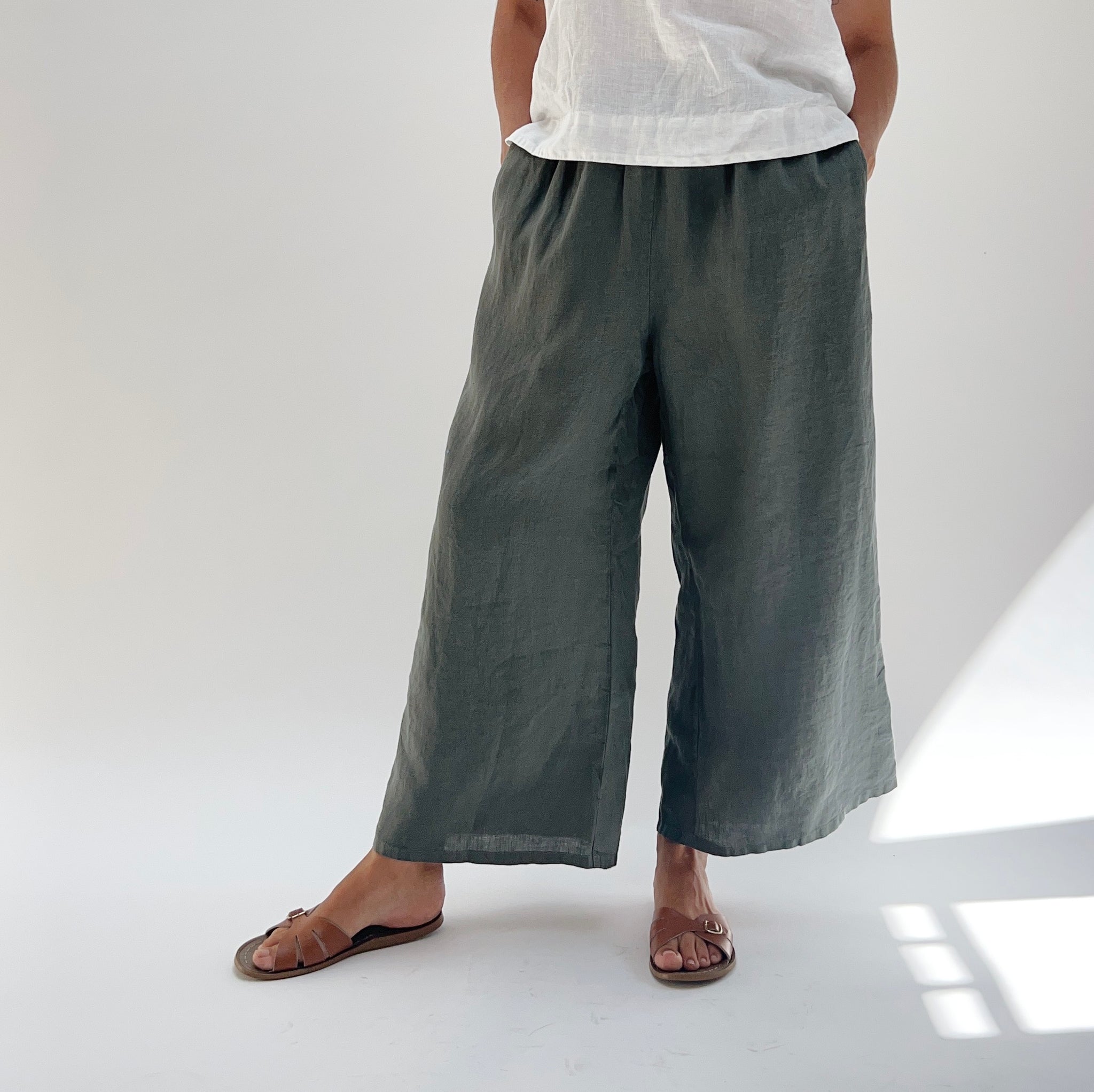 Super comfortable and chic linen pants featuring a cropped leg, an elastic waistband, and two pockets.