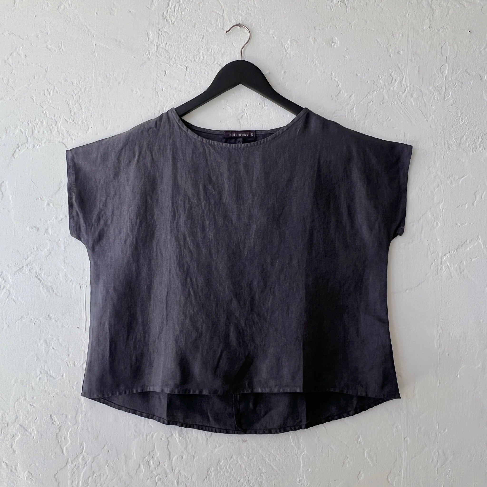 The perfect chic and easy linen tee with a high-low hem from front to back and a flattering boatneck. Gull is a dark charcoal color.