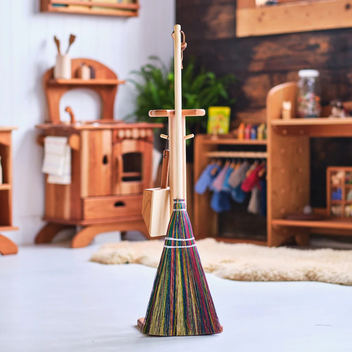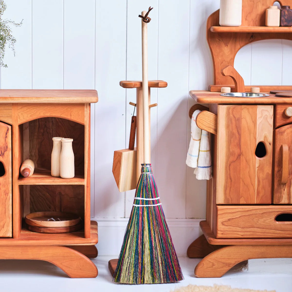 Created with natural broom corn grown in Tennessee and a wood handle. The master broom smith employs age-old techniques and uses machinery that is over 100 years old. Although the broom is called a toy its solid construction is the real thing.
