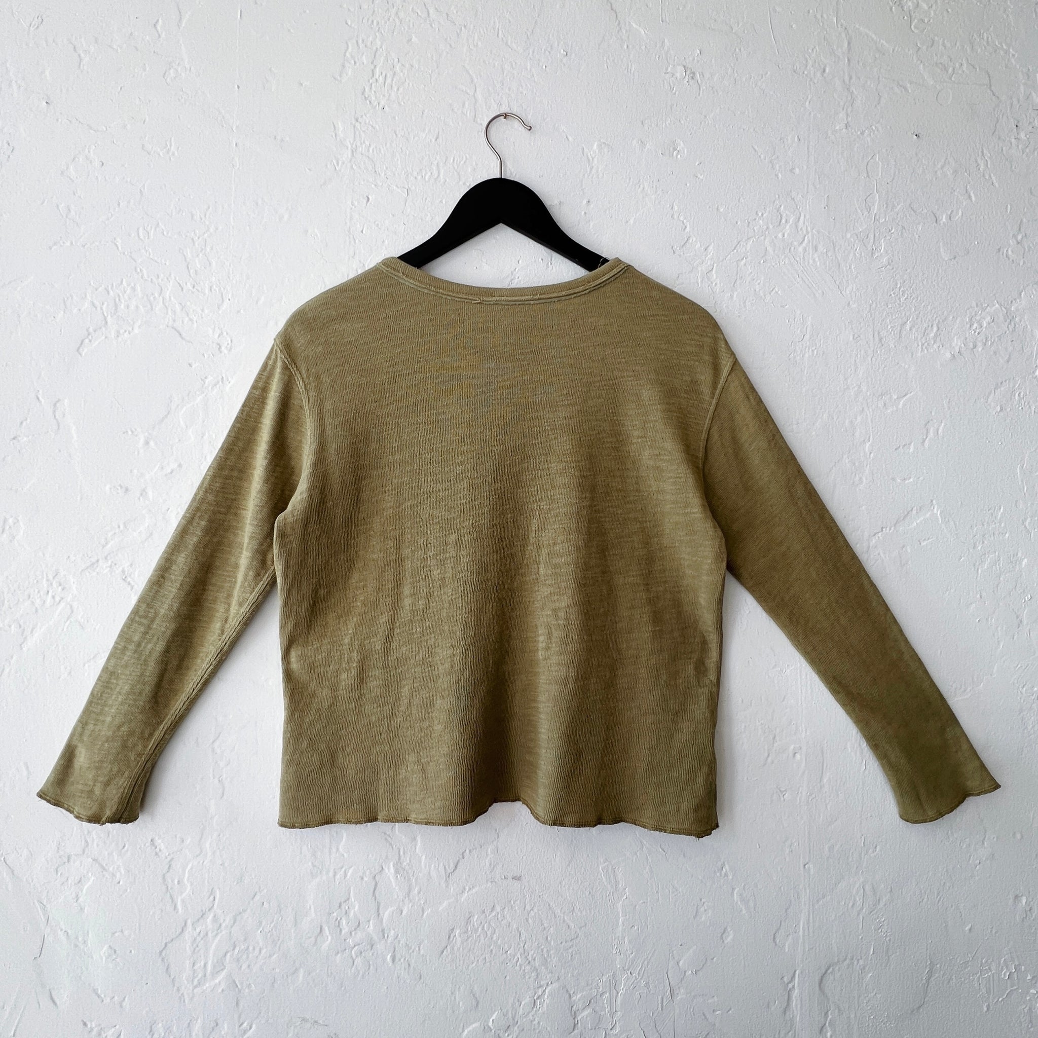 Cozy double-layered cotton top with raw hem neckline and slightly cropped sleeves.