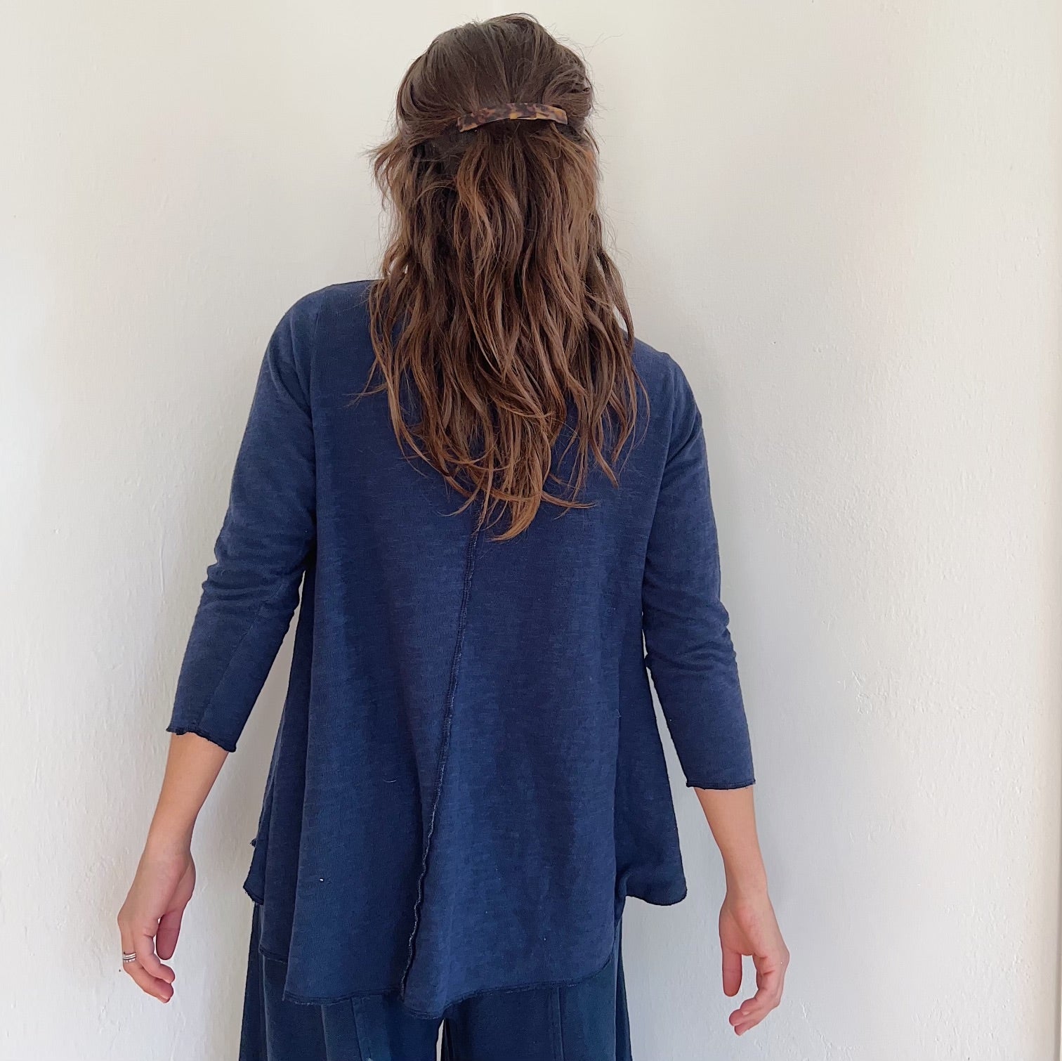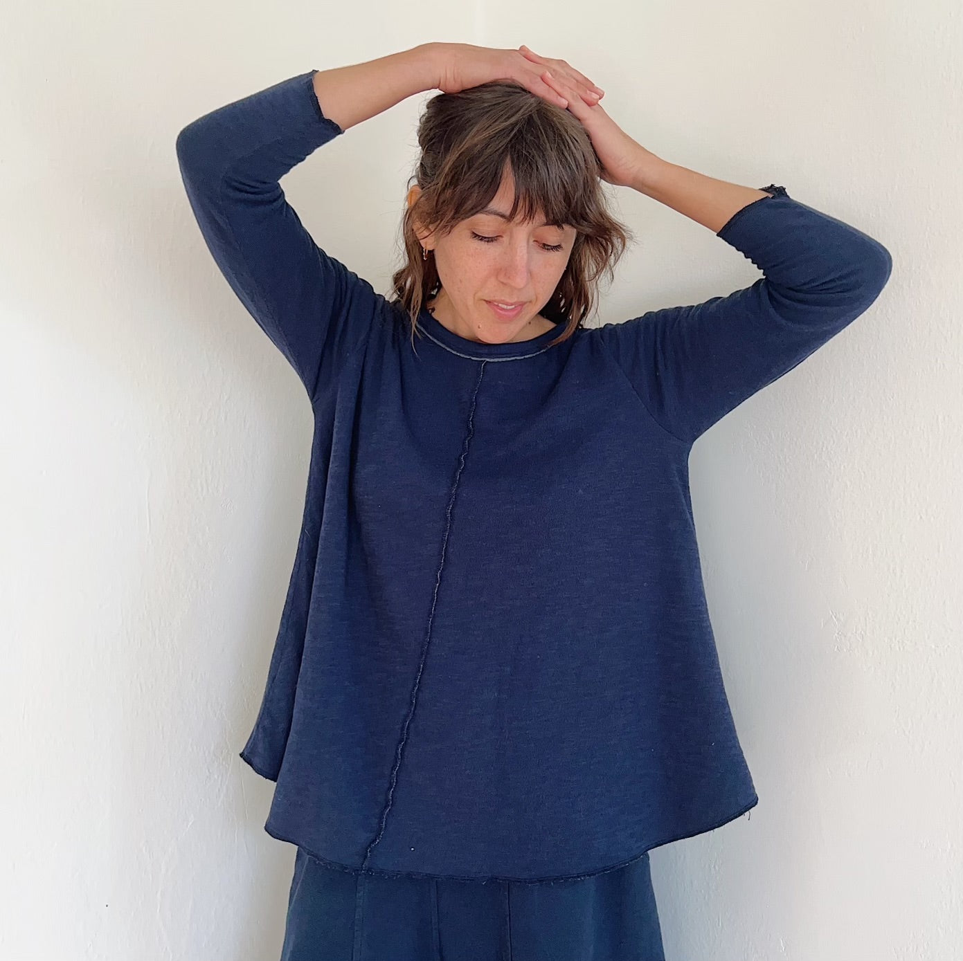 Cozy double-layered cotton top with raw hem neckline, vertical seam down the front and back, and slightly cropped sleeves.