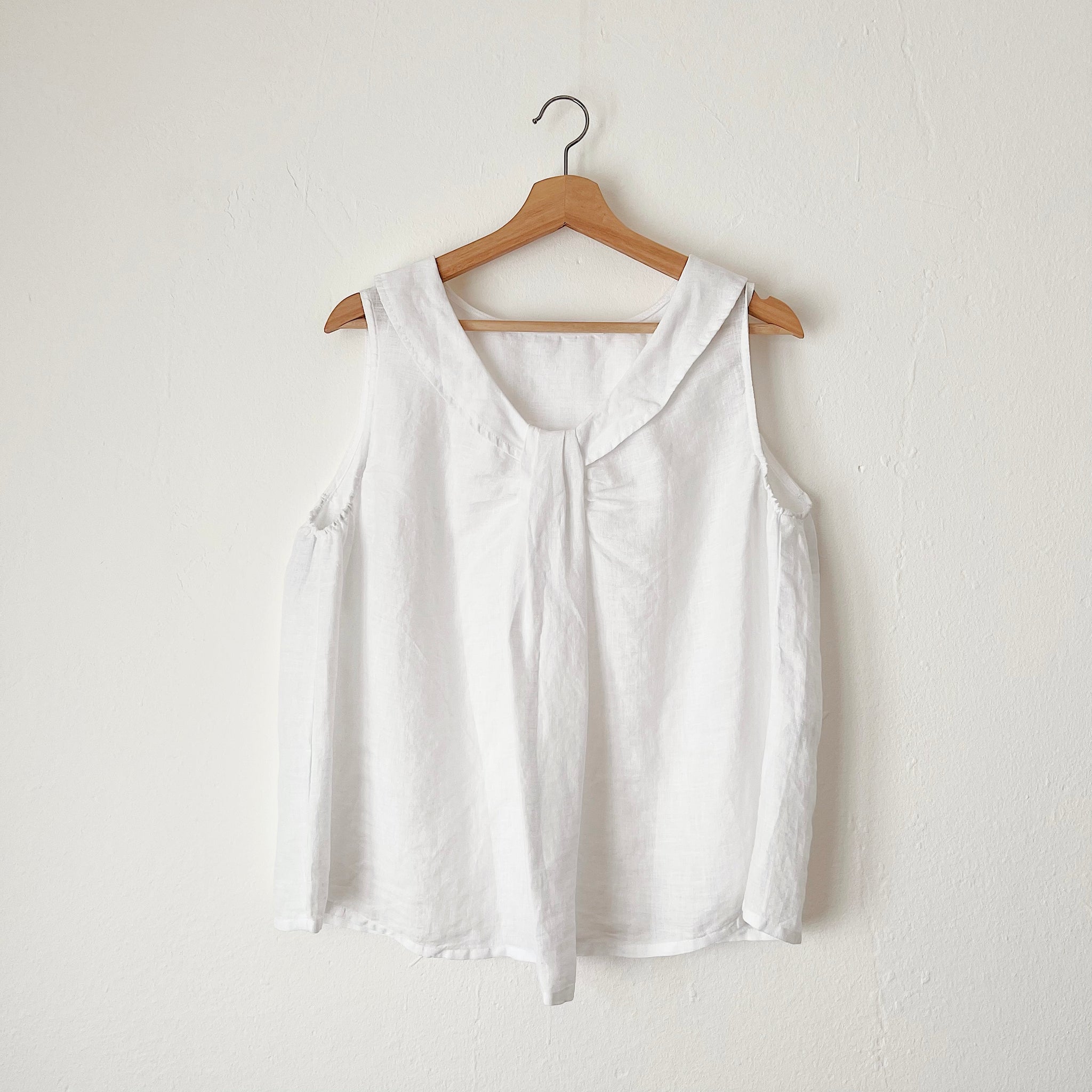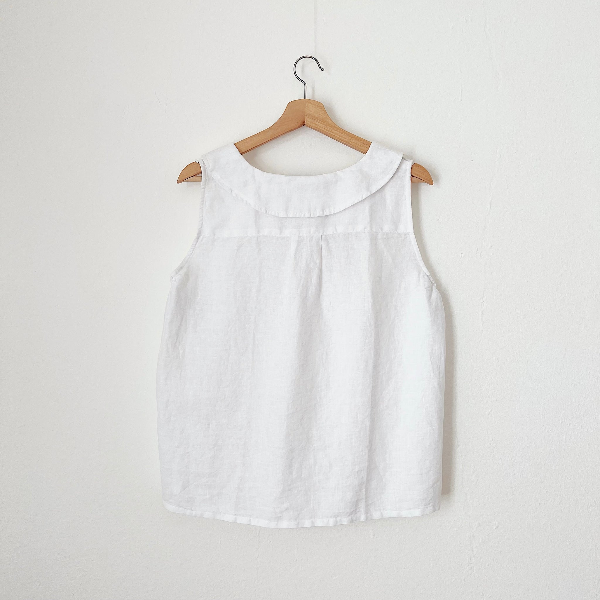 A white linen sleeveless top with a round neckline, hanging on a wooden hanger against a white wall.