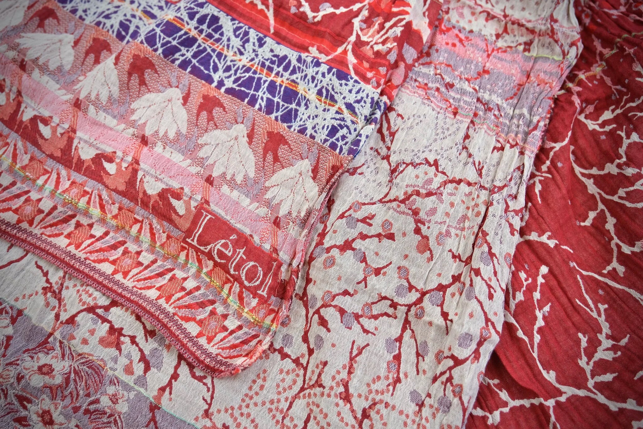 Létol scarf, crafted in France with certified organic/bio cotton (96% cotton & 4% recycled fibers). All-season reversible design, featuring artisanal Jacquard patterns and rich textures from interlaced colored threads (no prints).