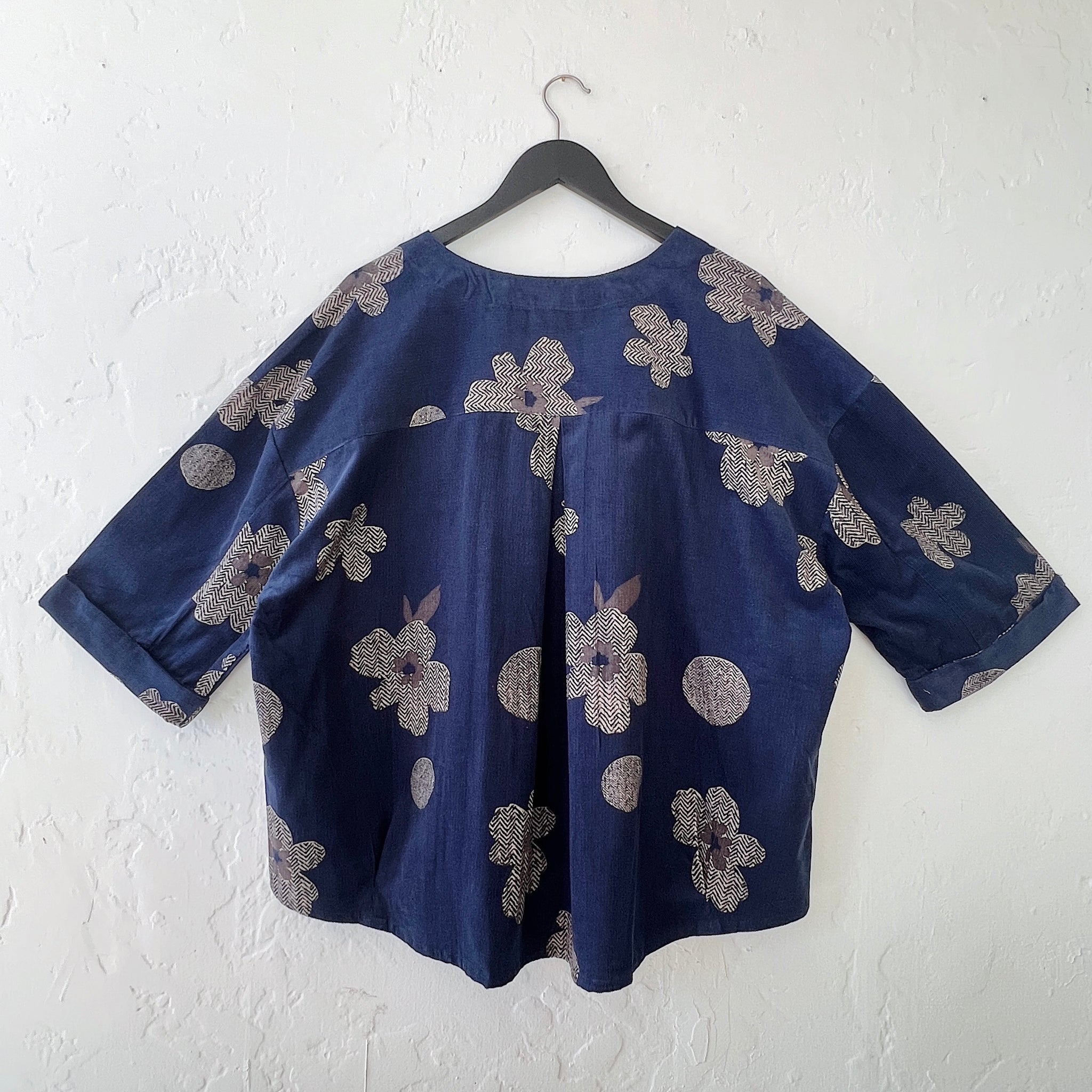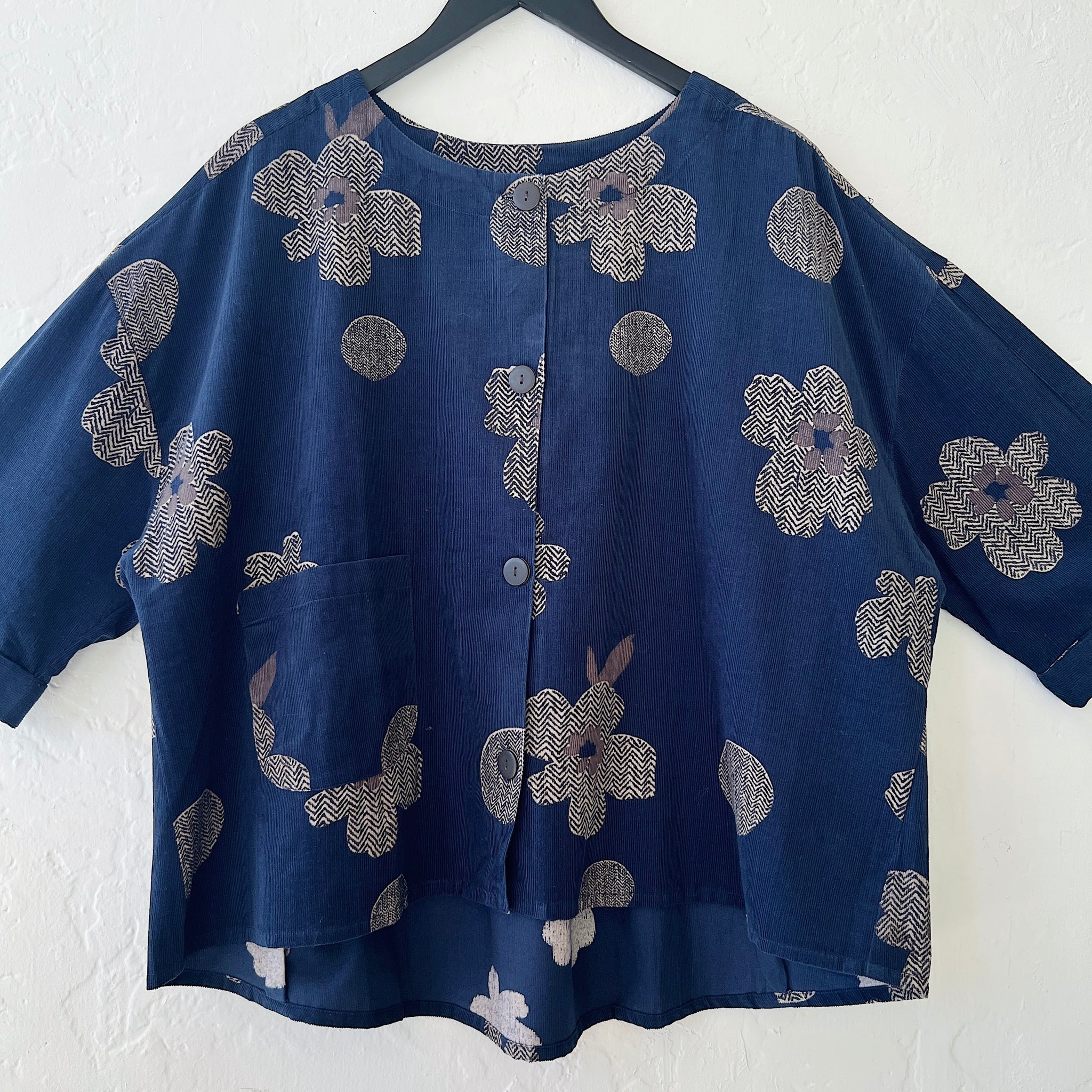Mona Lisa | Corduroy Tuck Crop Jacket in Dark Blue Blossom Print