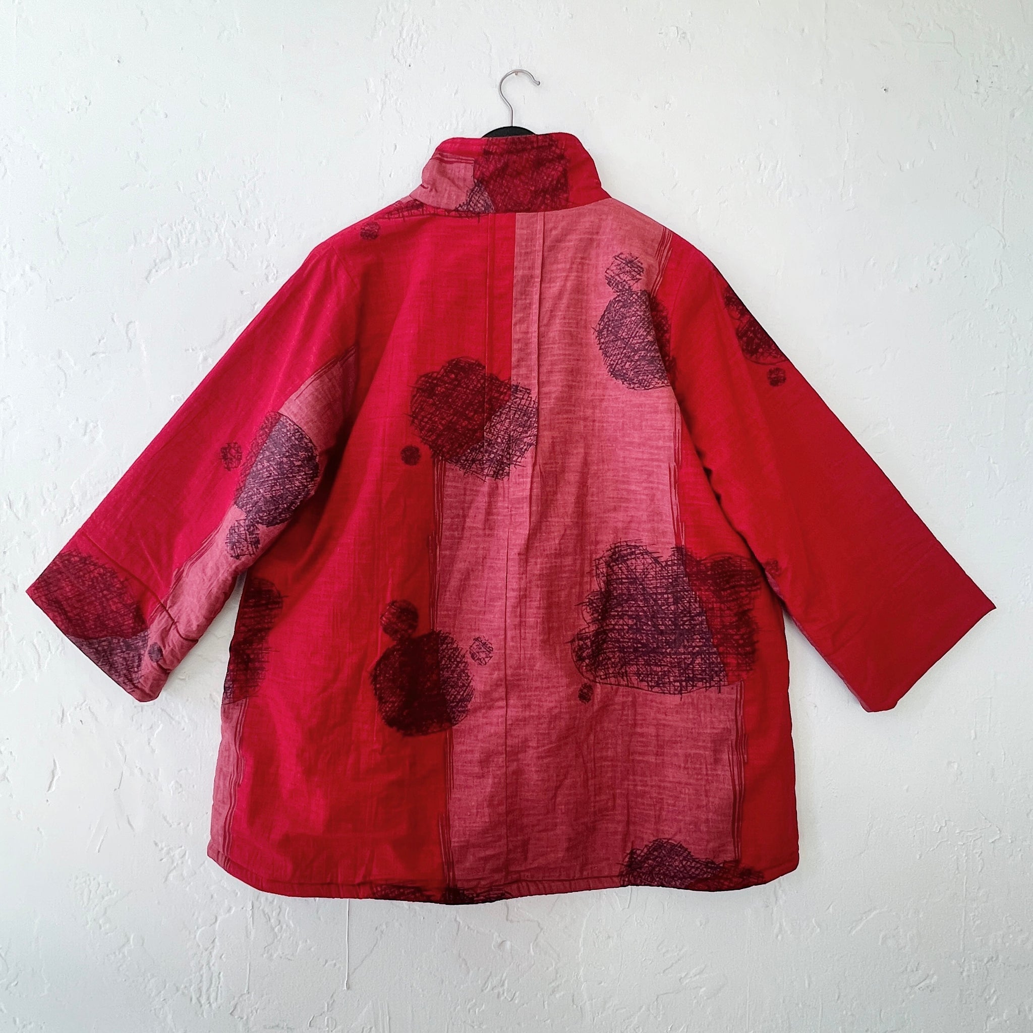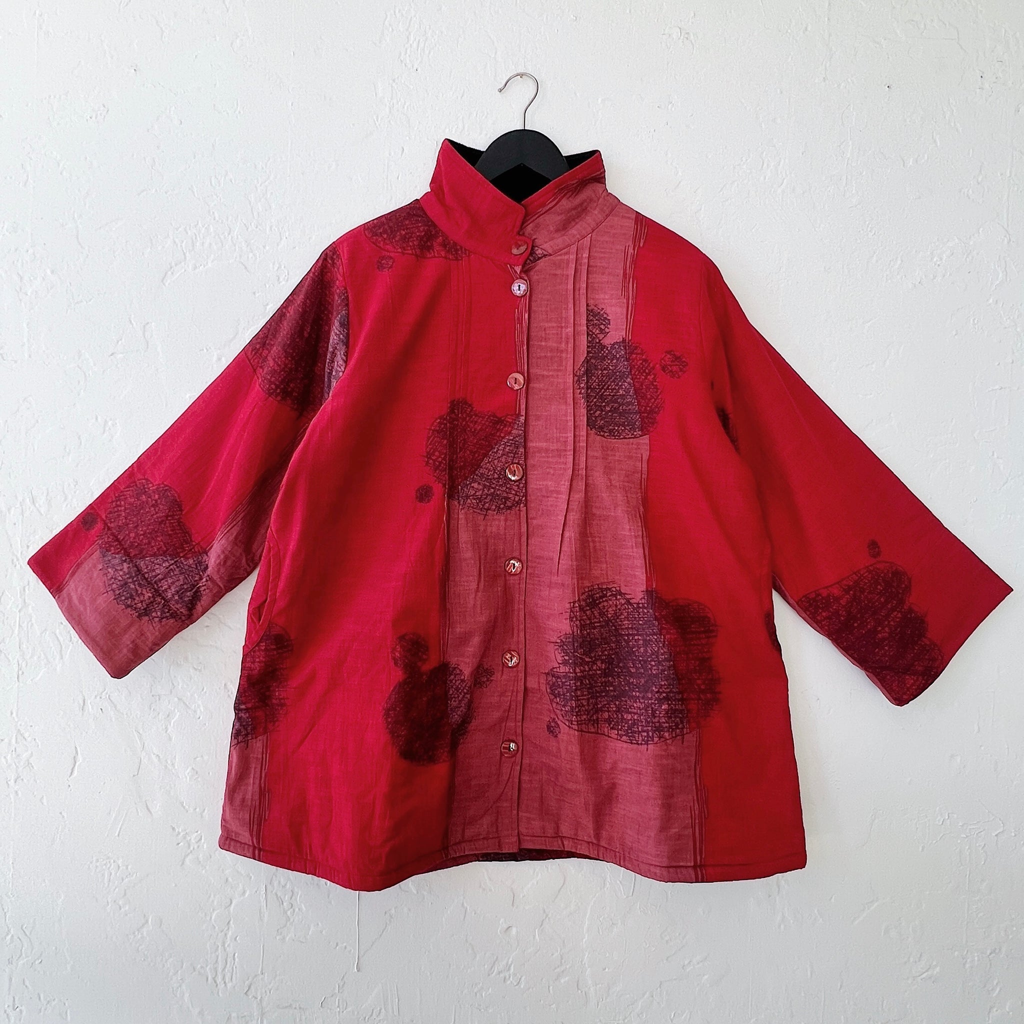 • Load image into Gallery viewer, Mona Lisa | Cowl Neck Pintuck Fleece Lined Jacket in Red Meshed Patch Print
