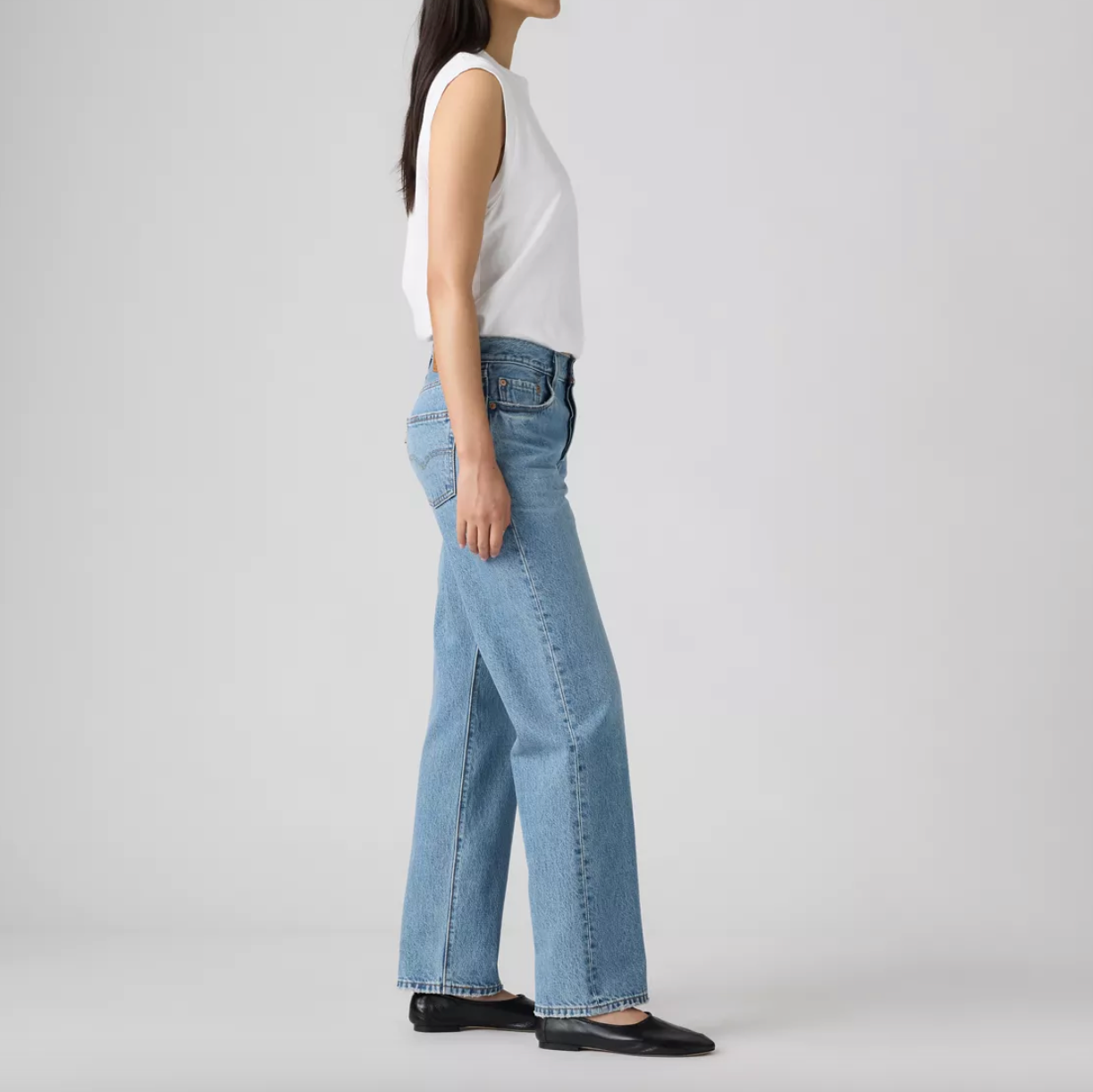 Person wearing light blue jeans and a white top on a plain background