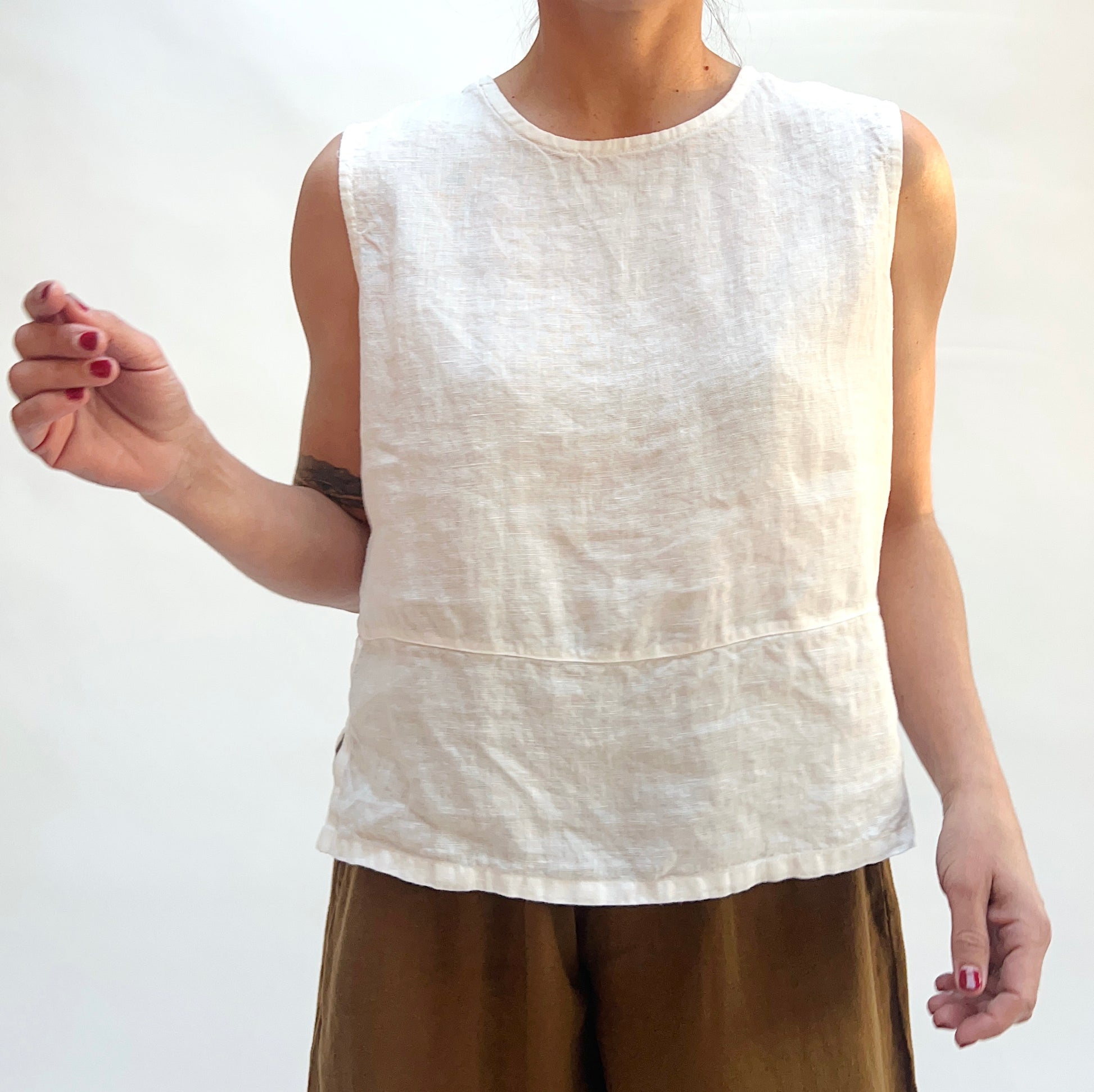 A perfect shell tank featuring a mother of pearl button closure at the back of the neck.